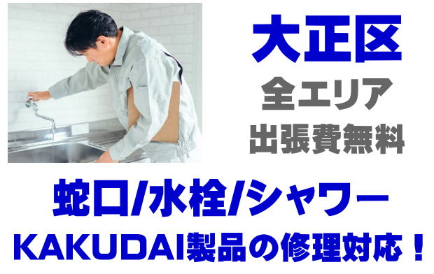 大正区で水栓メーカーKAKUDAIの修理業者をお探しなら当社までお気軽にお問い合わせください。蛇口の水漏れ、シャワーの故障などカクダイ製に関するトラブルなら何でもご相談ください。