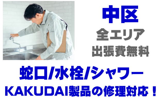 中区で水栓メーカーKAKUDAIの修理業者をお探しなら当社までお気軽にお問い合わせください。蛇口の水漏れ、シャワーの故障などカクダイ製に関するトラブルなら何でもご相談ください。