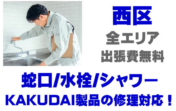 西区で水栓メーカーKAKUDAIの修理業者をお探しなら当社までお気軽にお問い合わせください。蛇口の水漏れ、シャワーの故障などカクダイ製に関するトラブルなら何でもご相談ください。